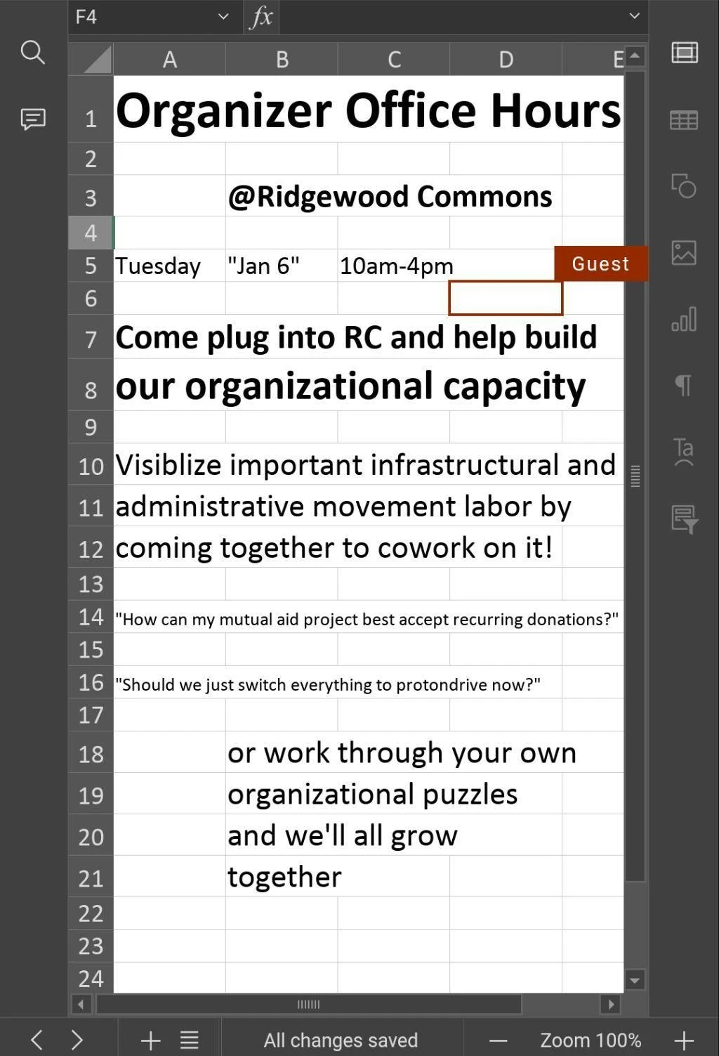Cowork, collaborate, and discuss important infrastructural and administrative movement labor by coming together to cowork on it!