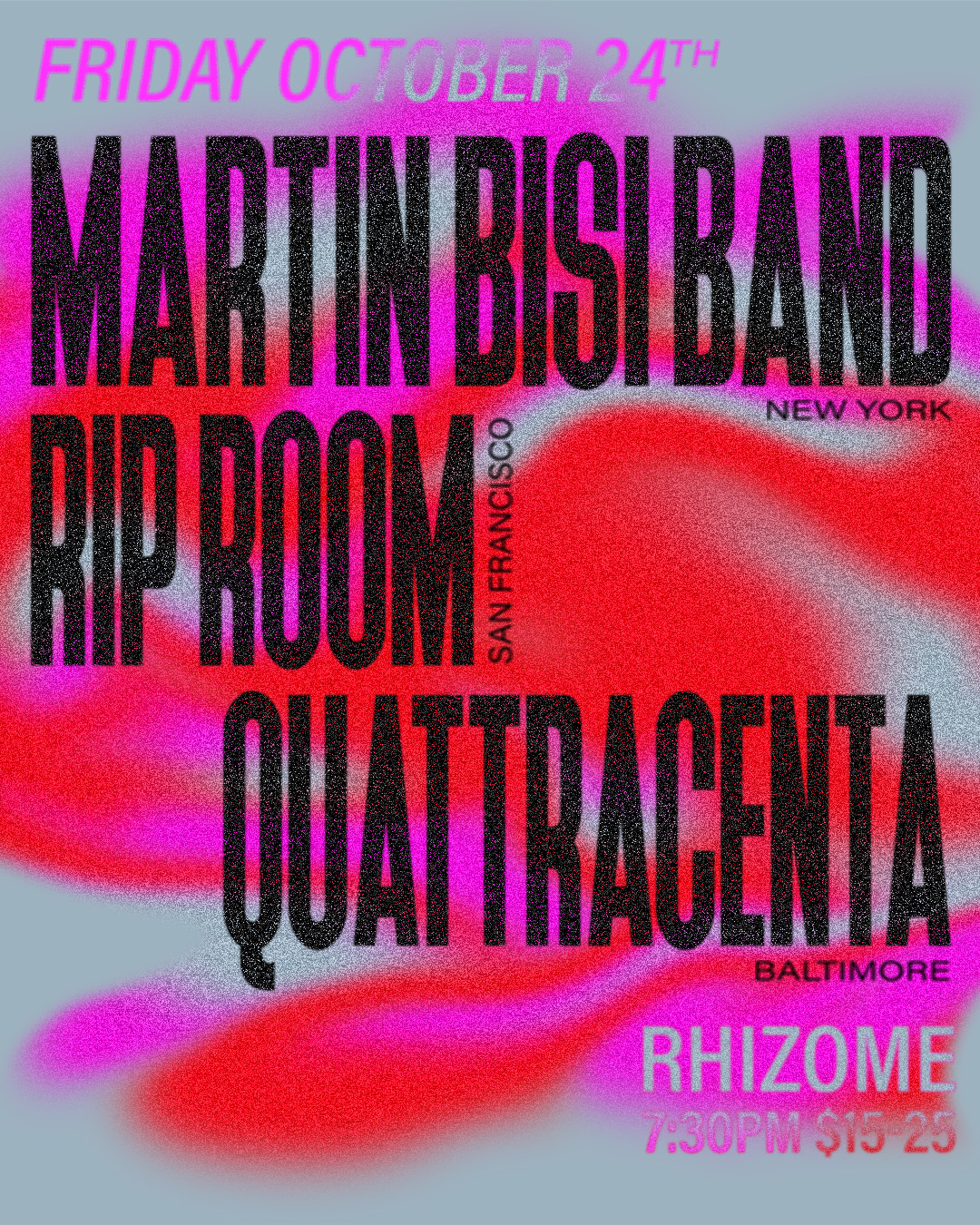 Once described as “dance music for people who don’t like to dance,” Rip Room prefers the humble designation “dance music for people who like to dance … but are also bummed out”. This three-piece from San Francisco play high-energy art punk with a math-y, prog edge — propulsive rhythms and piercing lyrics, but with a sense of buoyancy — wolves in sheep’s clothing. The band released their first full length LP with Spartan Records and is currently working on their next record.