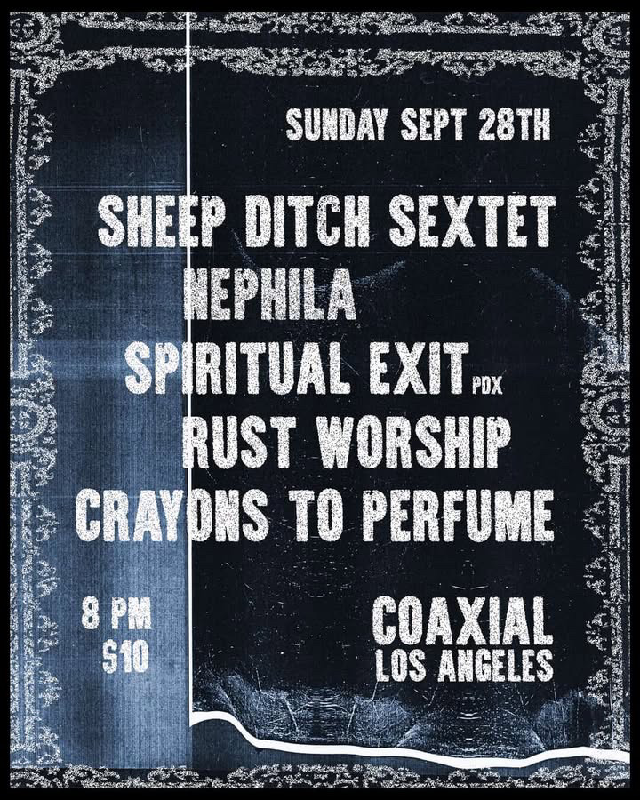 The last Sunday of September welcomes some of our favorite local experimental heavyweights as well as Portland's Spiritual Exit, the most recent project from Aaron Davis of Acre fame. Joining him will be a special supergroup six-piece iteration of Sheep Ditch, Shannon Kennedy's incredible Nephila solo project, industrial-noise cacophony from Rust Worship, and softcore-industrial pioneers Crayons To Perfume.