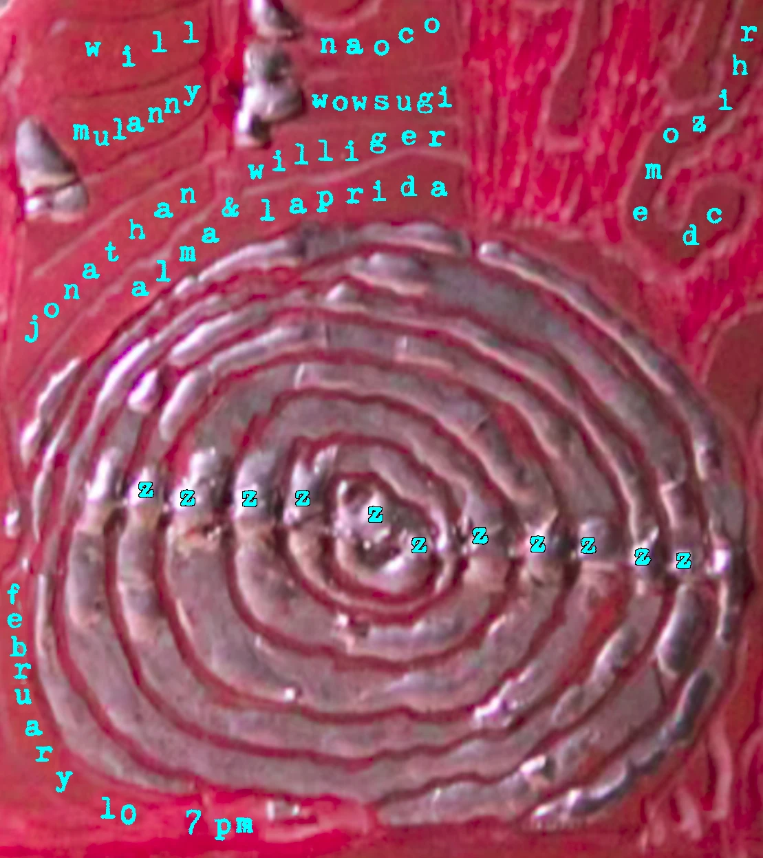 ZZZZZZZZZZ is a transcendental sound dozing experience, weaving tones including gong baths, theremins, plant synthesizers, cassette loops, poetry, ambient drones, vinyl DJ sets and more.