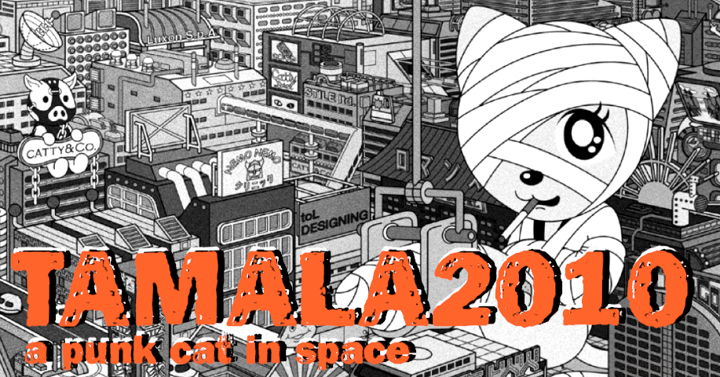 TAMALA 2010: A PUNK CAT IN SPACE is the story of our titular Tamala (don’t call her Tam). Despite her cute looks, Tamala is no baby. She smokes, she drinks, she curses, she starts fires, she struts ass. Certainly not appropriate behaviour for the corporate face of CATTY & CO. Feeling stifled by her overbearing human mother and a general sense of ennui, Tamala decides to steal a rocketship and hightail it off the planet Aye Es Aye Pee. With her boyfriend Michaelangelo (don’t call him Moimoi) by her side, the two work to uncover the mysteries of Tamala’s real family, her true nature, and her shocking purpose in the universe.
