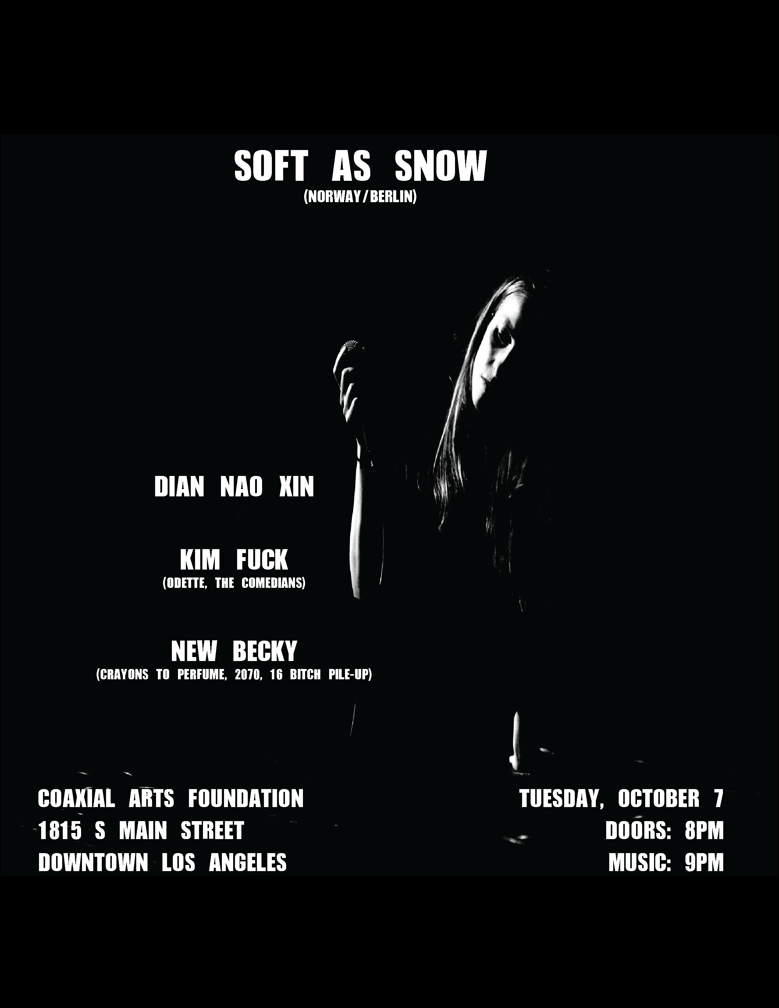 Coaxial is excited to welcome Berlin-by-way-of-Norway avant/experimental-pop duo Soft As Snow for the Los Angeles stop of their 2025 U.S. tour. With local support from One Child Policy, Kim Fuck (member of Odette and The Comedians), and New Becky (members of Crayons To Perfume, 2070, 16 Bitch Pile-Up)!