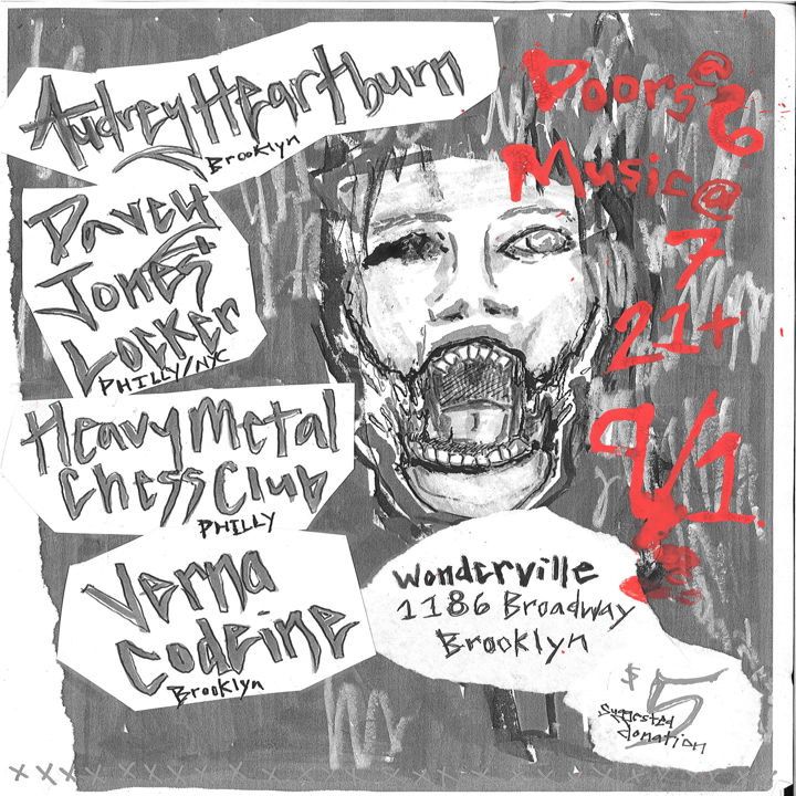 Monday is the new Friday. Come on out and enjoy a night of loud, raw DIY rock and emo from local favorites Audrey Heartburn and Verna Coedine, with Philly’s Heavy Metal Chess Club and Davy Jones’ Locker.