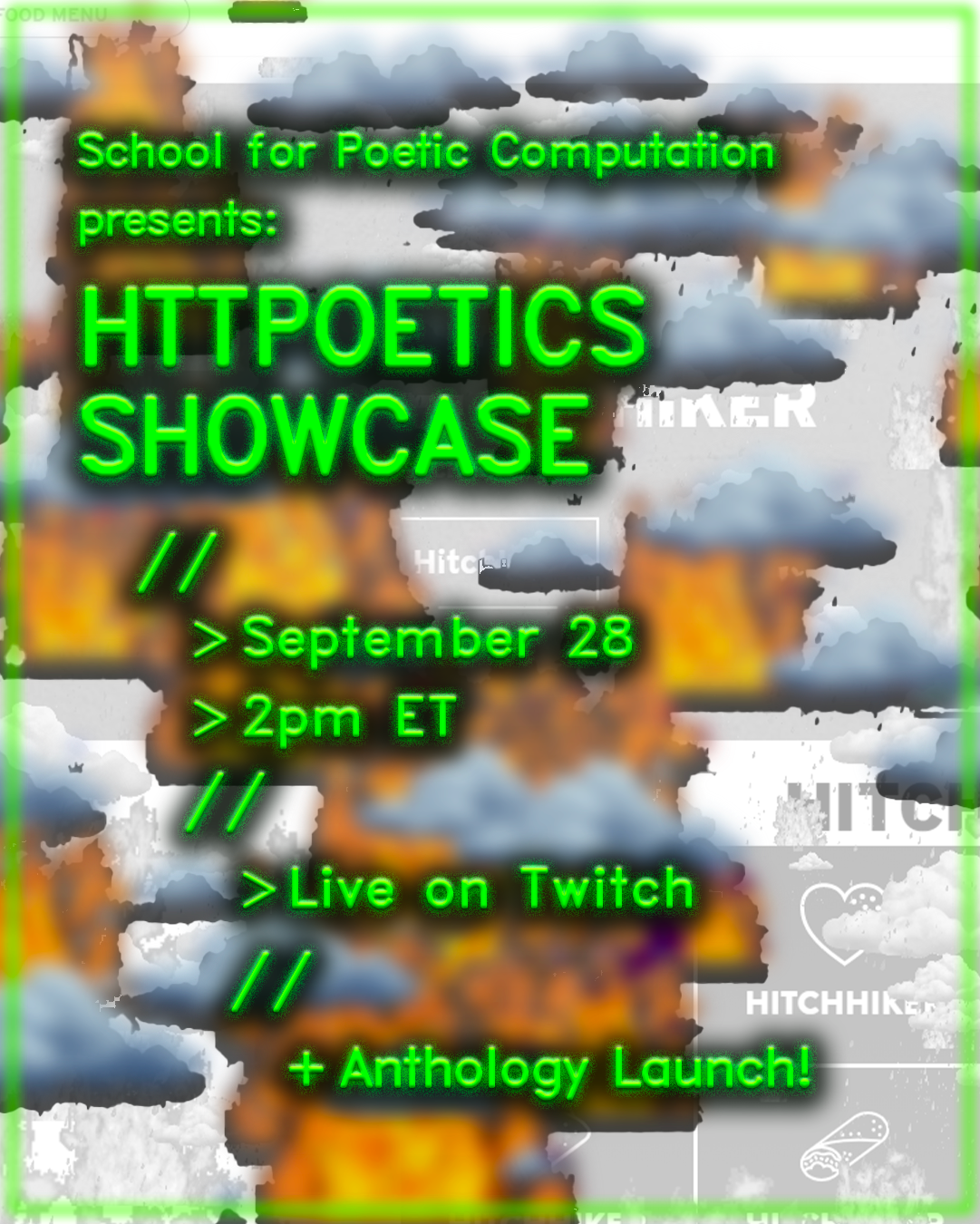 Join us for a series of presentations and performances from the students of HTTPoetics at School for Poetic Computation and help us celebrate the launch of our class anthology! This event will be broadcast live on the SFPC twitch channel: https://twitch.tv/sfpc_nyc