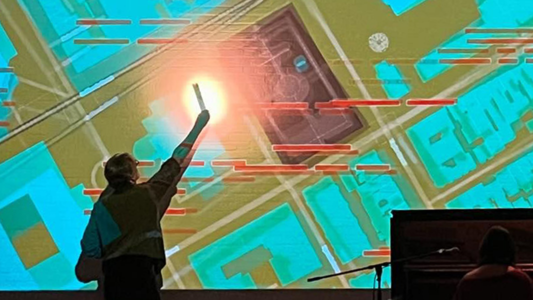 Real time cartographic improvisations using projected, manipulated digital maps, in collaboration with local musicians. A visual wash of street grids, land masses, water bodies, and curiosities from built and natural environments. Orphaned labels and free-floating symbology. Auditory roundabouts. Saturated colors and the subtlest of tints. Acoustic cul-de-sacs. Jittery zooms, pans, and traversals. Glitches in crowdsourced data.