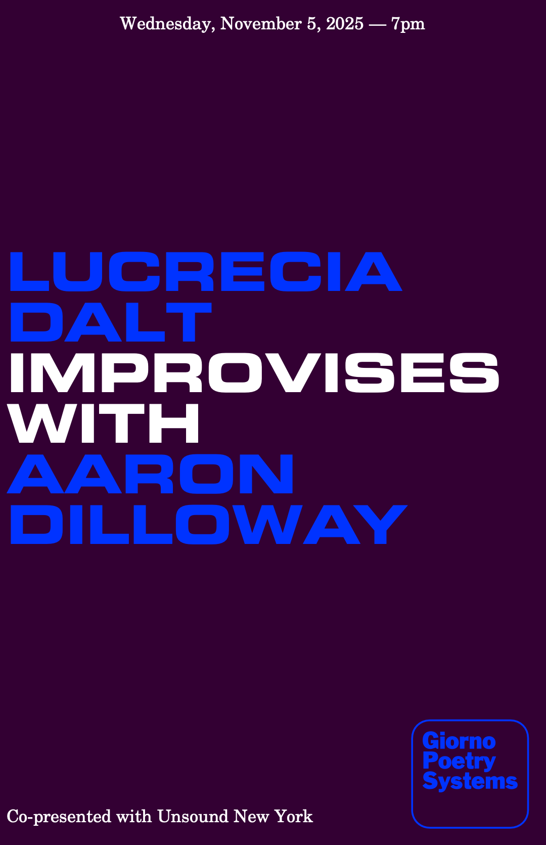 Thank you to Andy Battaglia, Mat Schulz, Gosia Plysa, and Matt Werth. This is co-presented with Unsound New York and made possible with the friendly support of the Ernst von Siemens Music Foundation.