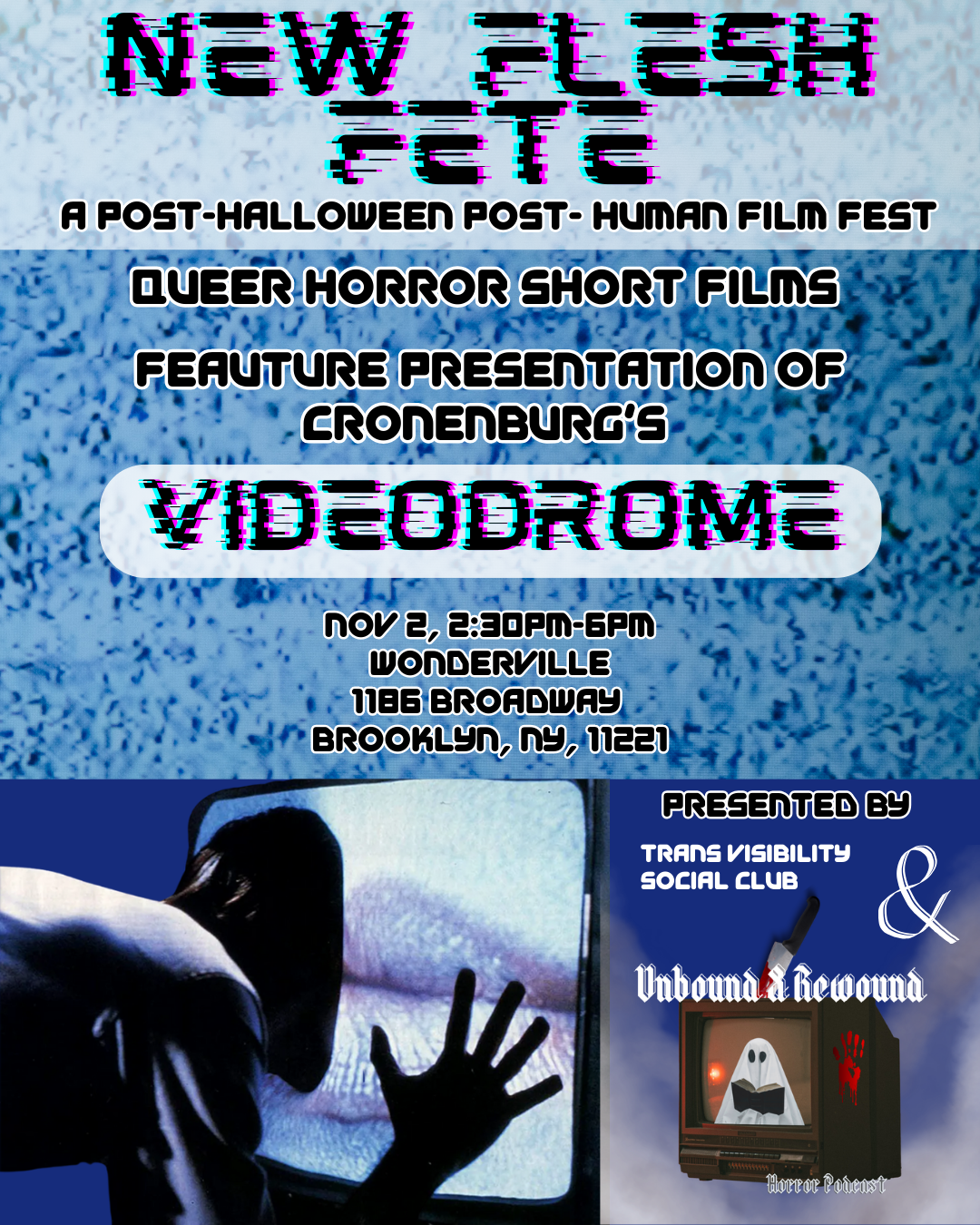 The Trans Visibility Social Club, in collaboration with the Brooklyn-based URHorror Podcast, presents NEW FLESH FETE: a post-Halloween, post-human film festival. Come for the queer horror short films and stay for the feature presentation of David Cronenberg's VIDEODROME.