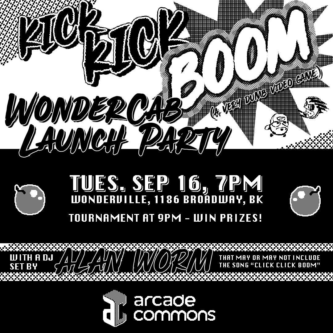 Kick Kick Boom is coming to the Wondercab! Inspired by Arcade Commons classics like Nothing Good Can Come of This and Super Sharp Birds, KKB dares to ask the question "what if those games were louder, dumber, and inspired by a bad pun on a numetal song from the Fast and Furious trailer?" This game doesn't exist anywhere else outside of the laptop it was built on, so come out to celebrate, blow up your friends, and win prizes in a tournament. Featuring a DJ set by Alan Worm, which we promise will not be entirely numetal tracks.