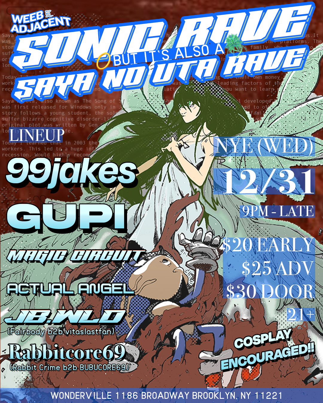 Bring your chili dogs and meat vision and get ready to get LOVECRAFTIAN all New Year's Eve with Sonic and Saya no Uta fans and the best DJs the algorithm has to offer!! We'll be bringing all the anisong hard dance, happy hardcore, hyperpop, and internet music in between via 99jakes, gupi, Magic Circuit, Actual Angel, JB.wld, and Rabbitcore69!!!