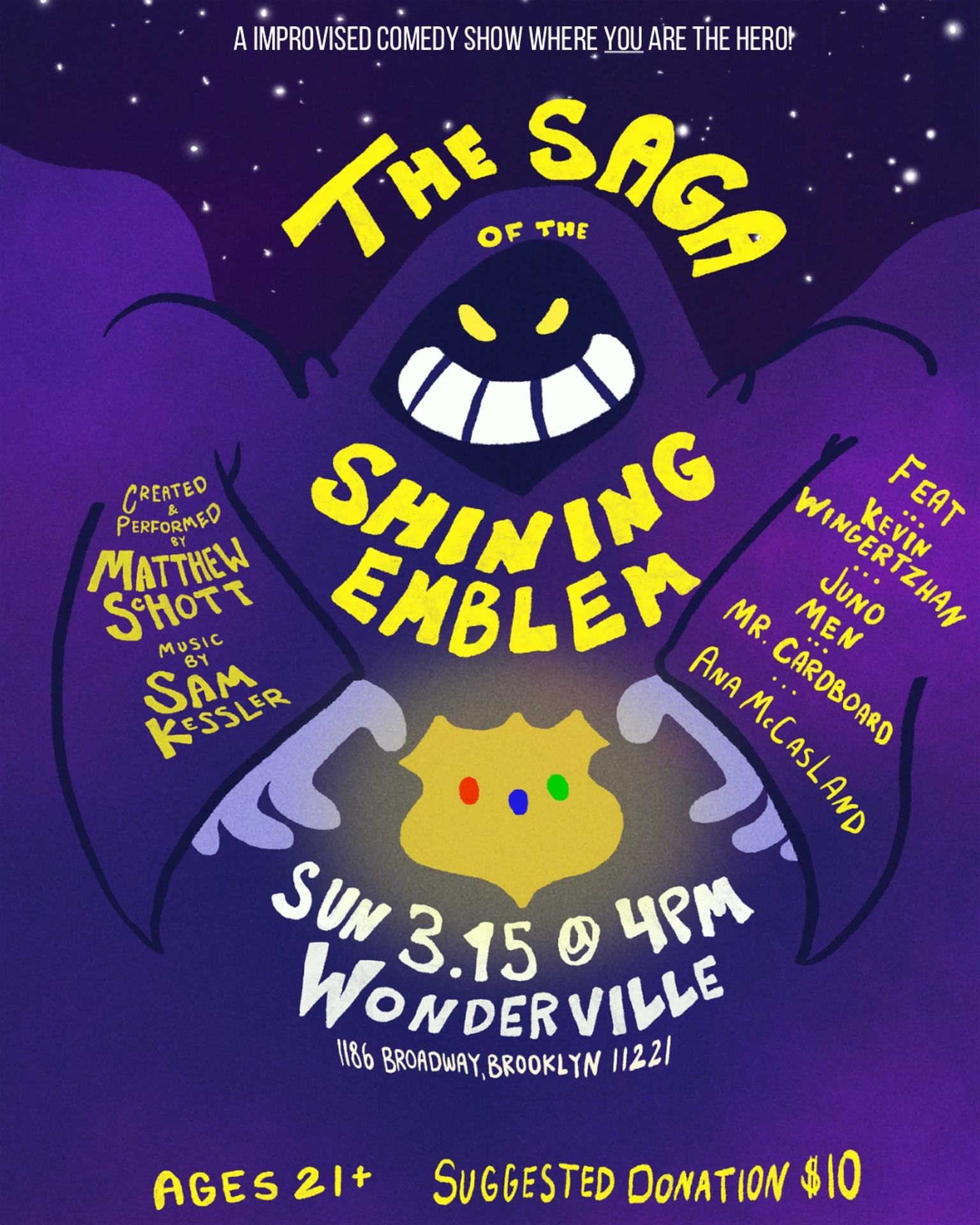 The Saga of the Shining Emblem, a one-of-a-kind improv comedy show where YOU get the chance to be the hero of your very own epic adventure! Each performance one lucky audience member is chosen to be the hero of their own grand quest, they are then guided on their journey by one actor playing both narrator and all other characters in the story. Their quest?? To seek the Shining Emblem, an object of unimaginable power capable of granting one wish to whomever finds it! How they find it and what they plan to do with all that power is totally up to them! All set to a live score!