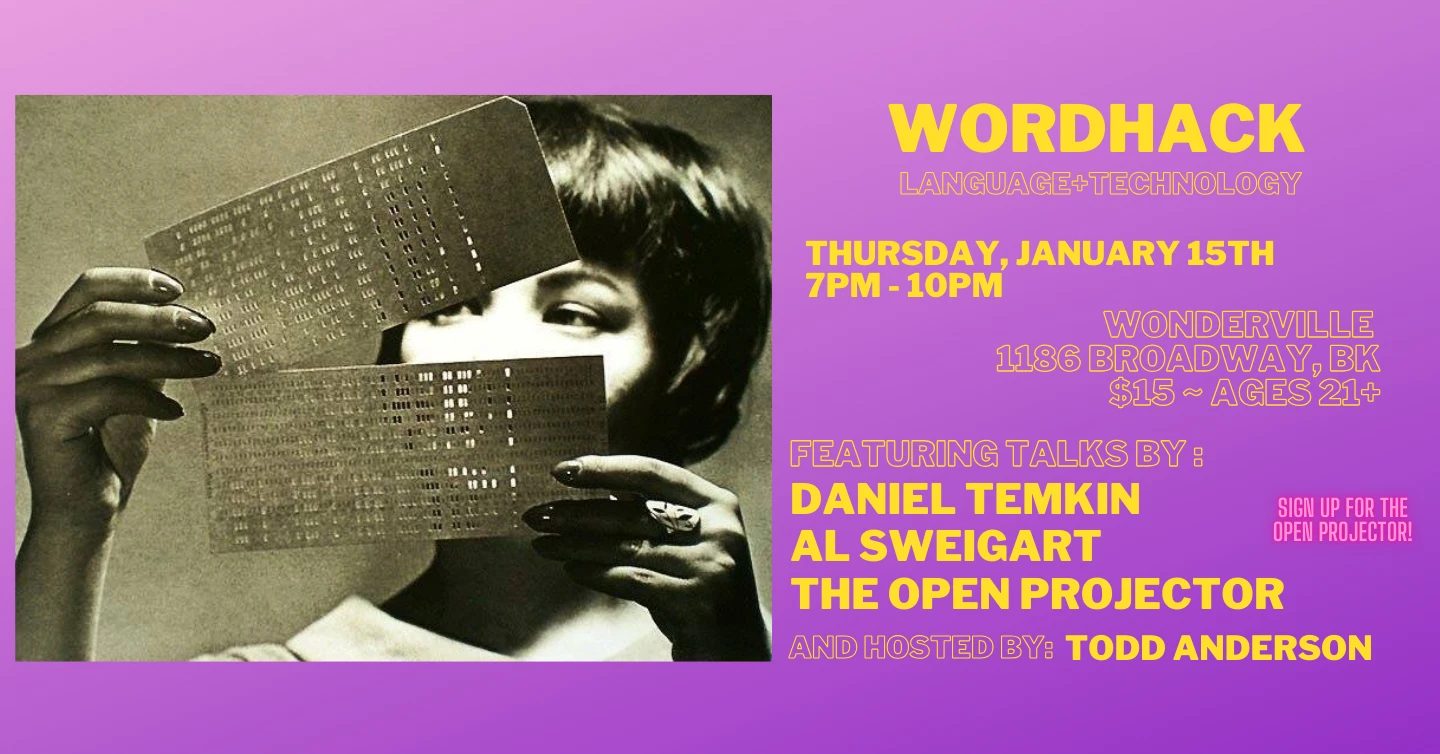 And to celebrate the new year we will have an EXTENDED OPEN PROJECTOR (like an open mic for digital work) where anyone can sign up to share a piece for 5 minutes at the start of the show. If you've been thinking about presenting at Open Projector this month is a great time! The open projector signup sheet will go out at 6:45 the day of the show, if you can't make it early and want to sign up send Todd an email at toddwords[at]gmail.com
