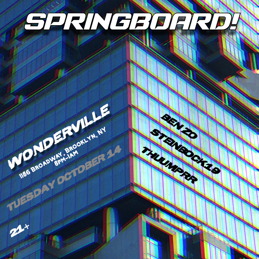 Springboard returns to Wonderville (1186 Broadway, NY) Tuesday October 14th! From 8pm-1am we will have techno sets from the talented Ben Zo, Steinbock19, and Thuumprr. Vibes will be dark, hypnotic, and groovy. The event is 21+. Entry is free, however, there is a suggested donation of $10 in order to help support the artists. QR codes will be printed throughout the venue.