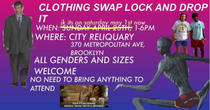 It's a mothaf*ckin clothing swap! All genders & sizes come thru! Give away the things you no longer love & take home some cute new shit! Outdoors & masked for optimal safety & sexiness