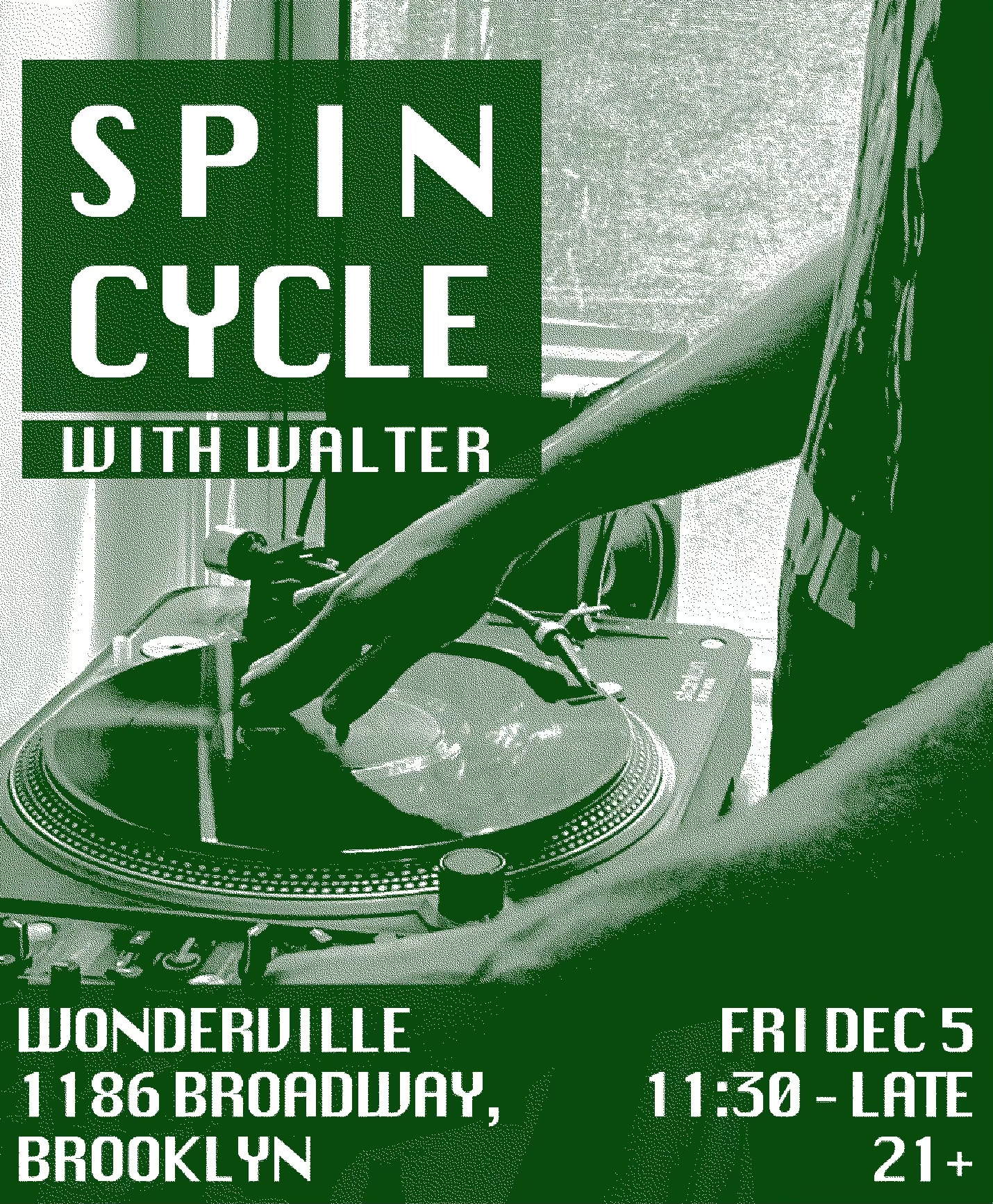Spin Cycle is a dance music event with a focus on vinyl. Resident DJ is Walter, whose love for deep machine-funk rhythms has made him a dedicated crate digger and selector. Come and shake your hips, spin around, do a cartwheel, however you like to get down is right for this one!