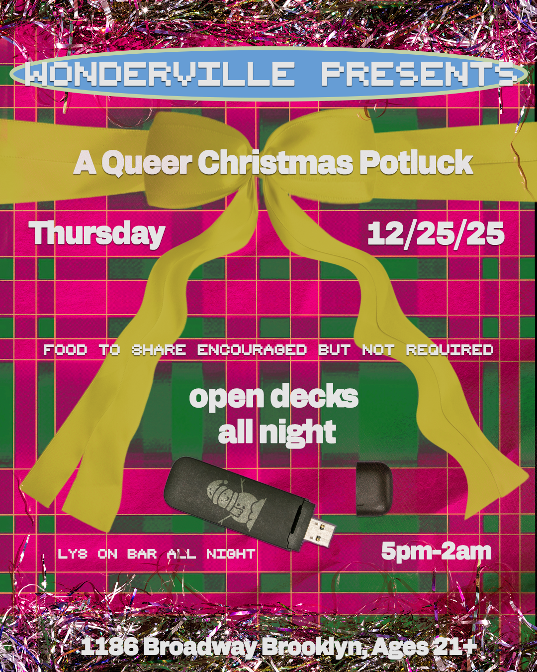 Happy Holidays from all of us at Wonderville! We'll be celebrating Christmas by hosting a queer community potluck, open to all!