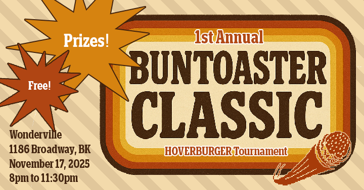 Join us at the 1st Annual BUNTOASTER Classic, a clash of the brightest and best HOVERBURGER players on Earth! Players will compete for the best average score after 3 runs with no previews! As always, savory prizes and bragging rights that will last a lifetime will be doled out to the top performers. No experience necessary, special recognition and prizes will be awarded to new and inexperienced players, as well. Come see what HOVERBURGER is all about!