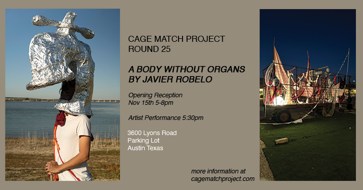 Cage Match Project (CMP) gallery lives in an industrial caged-trailer. Measured at 20x8x7 feet, this weathered and rusted container resides in a gravel parking lot in Austin, TX where it is under constant exposure to the elements and 24-hour public viewership. By fully embracing the caged-trailer as both literal and conceptual context, Cage Match Project purposefully stages a narrative of the artist-at-odds, with either history, space, or a work of art itself.