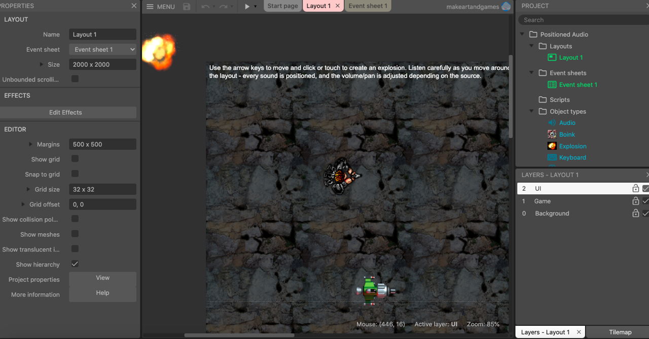 - Use keyboard or gamepad to explore a 2D world of their own creation