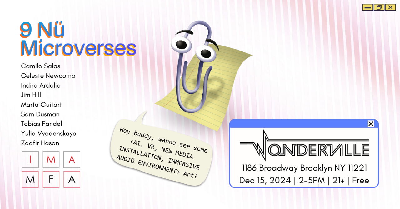 9 Nü Microverses: New media work from the CUNY Hunter IMA program Advanced Studio course led by Matthew Gantt - subversive chatbots, noisy games, non-noisy games, VR webscrape horror, analog glitch, bioluminescent sublime, friends and deep hangs.