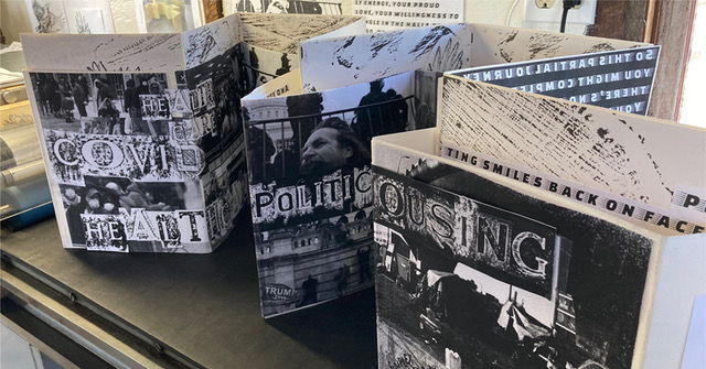 The new book, Heavy Lifting, is a close collaboration with poet Theresa Whitehill. It treats my personal loss, but also the collective crises of the last year, placing Theresa and I here on the cusp of an unimagined future, squaring off with terrible truths. I'll have a mock-up of the book and a prototype of the binding, along with some printed sheets. \[--Felicia Rice\]