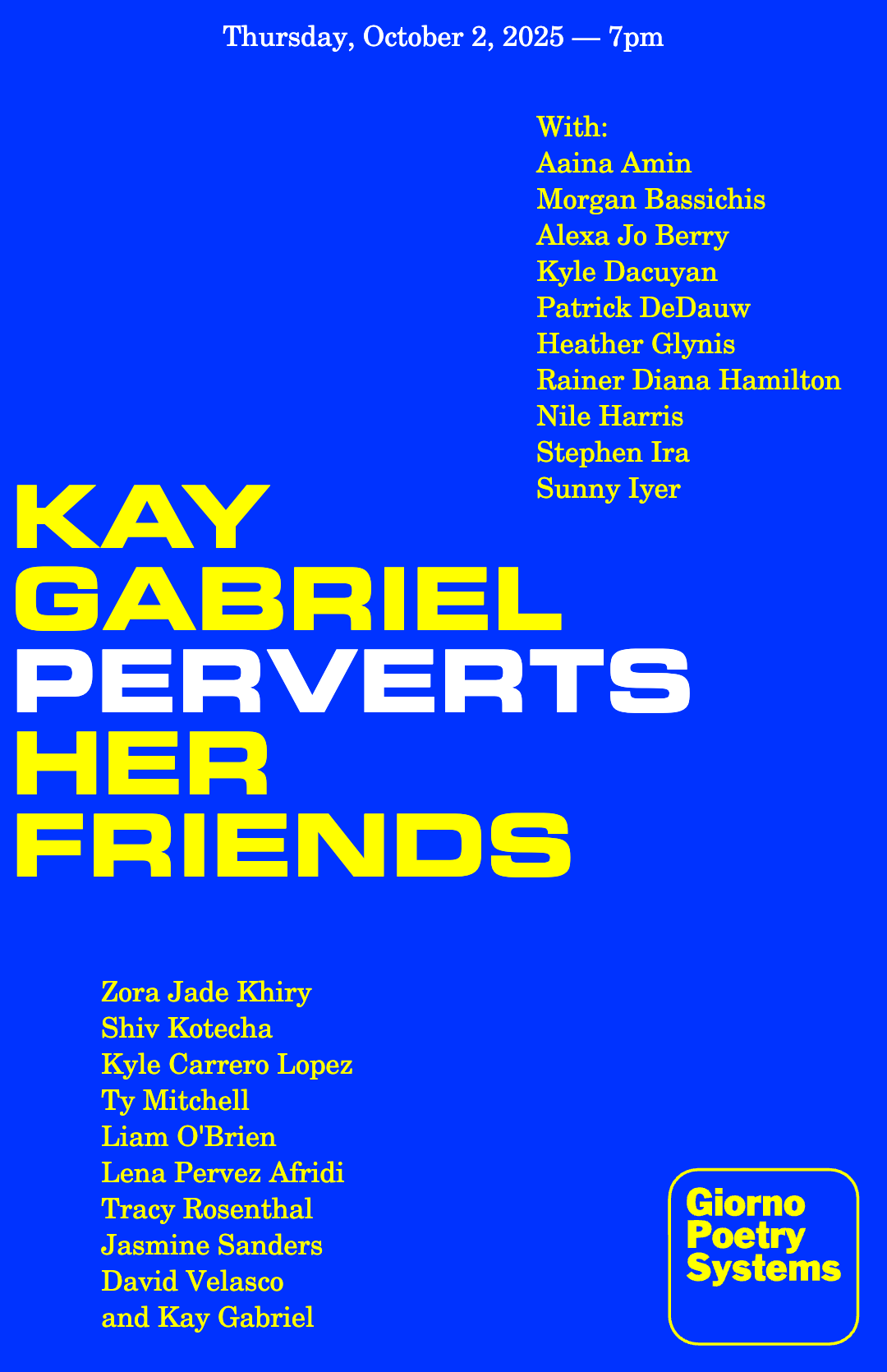 Kay Gabriel is a writer and organizer. She’s the author of A Queen in Bucks County (Nightboat, 2022) and Kissing Other People or the House of Fame (Nightboat, 2023). With Andrea Abi-Karam, she co-edited We Want It All: An Anthology of Radical Trans Poetics (Nightboat, 2020). She is the Editorial Director at The Poetry Project and lives in New York.