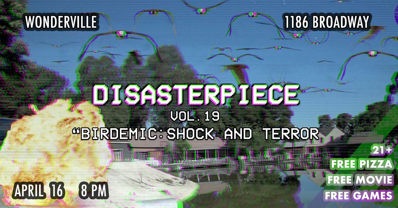 Disasterpiece is a movie night all about unearthing weird, forgotten VHS gems. This month it’s ‘Birdemic: Shock and Terror’, a zero-budget monster movie where the monsters are... just birds. Themed drinking rules, trivia, and mediocre pizza provided.