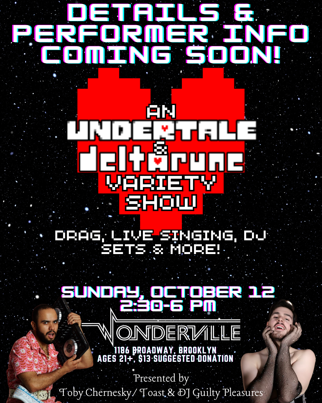 This event will feature a wide variety of entertainment, including performances by drag artists, live vocalists, and DJ Sets featuring music from the iconic Toby Fox games! Additionally, we’ll have some other fun activities to fill your inventory, including a cosplay contest and trivia- with prizes!