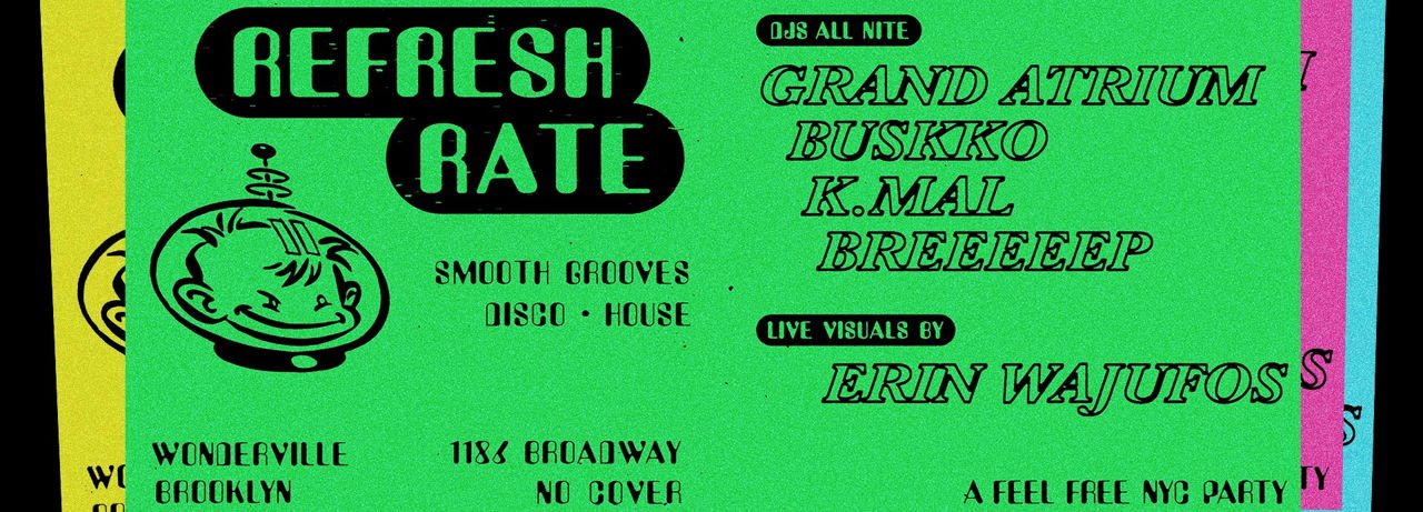 REFRESH RATE party returns to Wonderville ~ Soulful house, disco and live visuals all niteResident DJs Grand Atrium and Buskko will be joined on the decks by their frequent collaborators K.Mal and Breeeep to keep the dancefloor poppin’ all night long, throwing down our favorite soulful/deep house, disco heaters, and deep techno. Special guest VJ Erin Wajufos, a mainstay at Analog BKNY and Elsewhere, will be bringing her unique artistry as she performs live visuals all night long via projections and vintage analog TVsWonderville features free-to-play indie arcade games, a full bar, and a chilled out back patio - all the necessary ingredients for a perfect August night!
