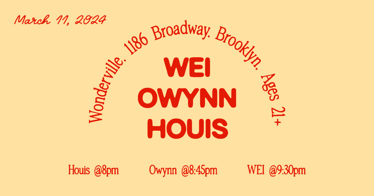 Three electronic artists team up for a night of groovy, lush tunes featuring Houis, Owynn & WEI. Well versed in neo-soul & hip-hop, the lads will play original tunes that smack and pop alongside delicious piano and guitar licks. Wonderville's audience can expect warm vibes, fun personality and a slew of great music the whole time from these three excellent musicians.