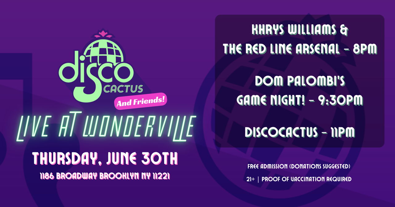 Three video-game-music-inspired fusion bands from the NY area join forces for a night of killer tunes and good vibes! DiscoCactus, an eclectic band of game audio professionals passionate about game music, will be joined by Khrys Williams and The Red Line Arsenal, a band that plays cool music from all kinds of places, and Dom Palombi's Game Night!, a funk-fusion band led by the fearless drummer Dom Palombi.