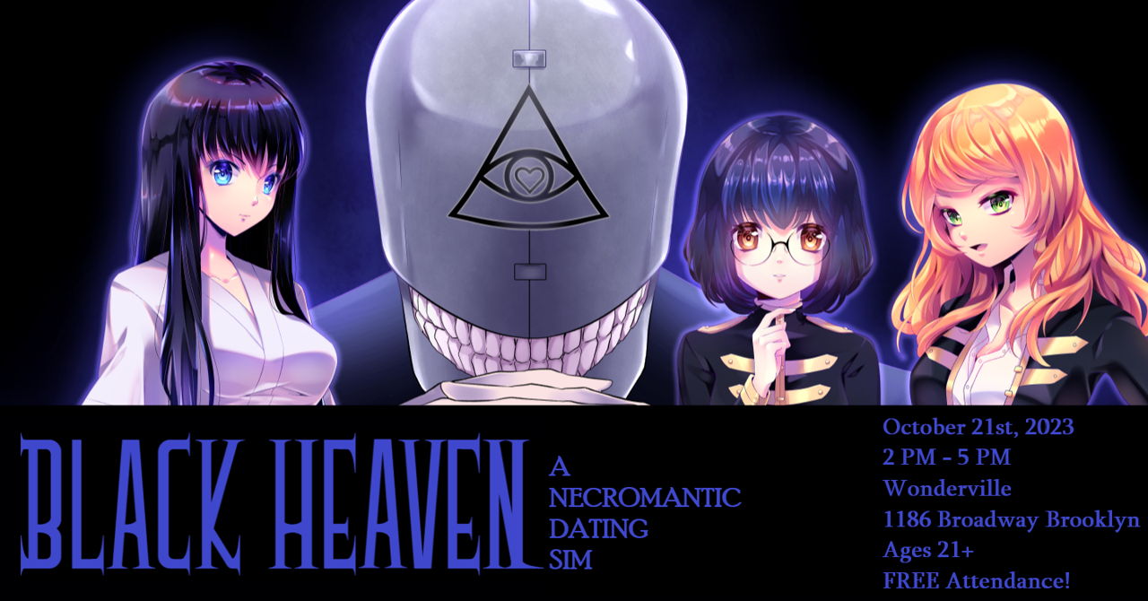 Do you like anime dating sims? Lo-fi beats? Psychological horror? Come join us for the launch of Black Heaven: A Necromantic Dating Sim! Play a demo of the game, listen to the amazing soundtrack, and join a fanart contest for the characters for a chance to win prizes! Who will you choose?