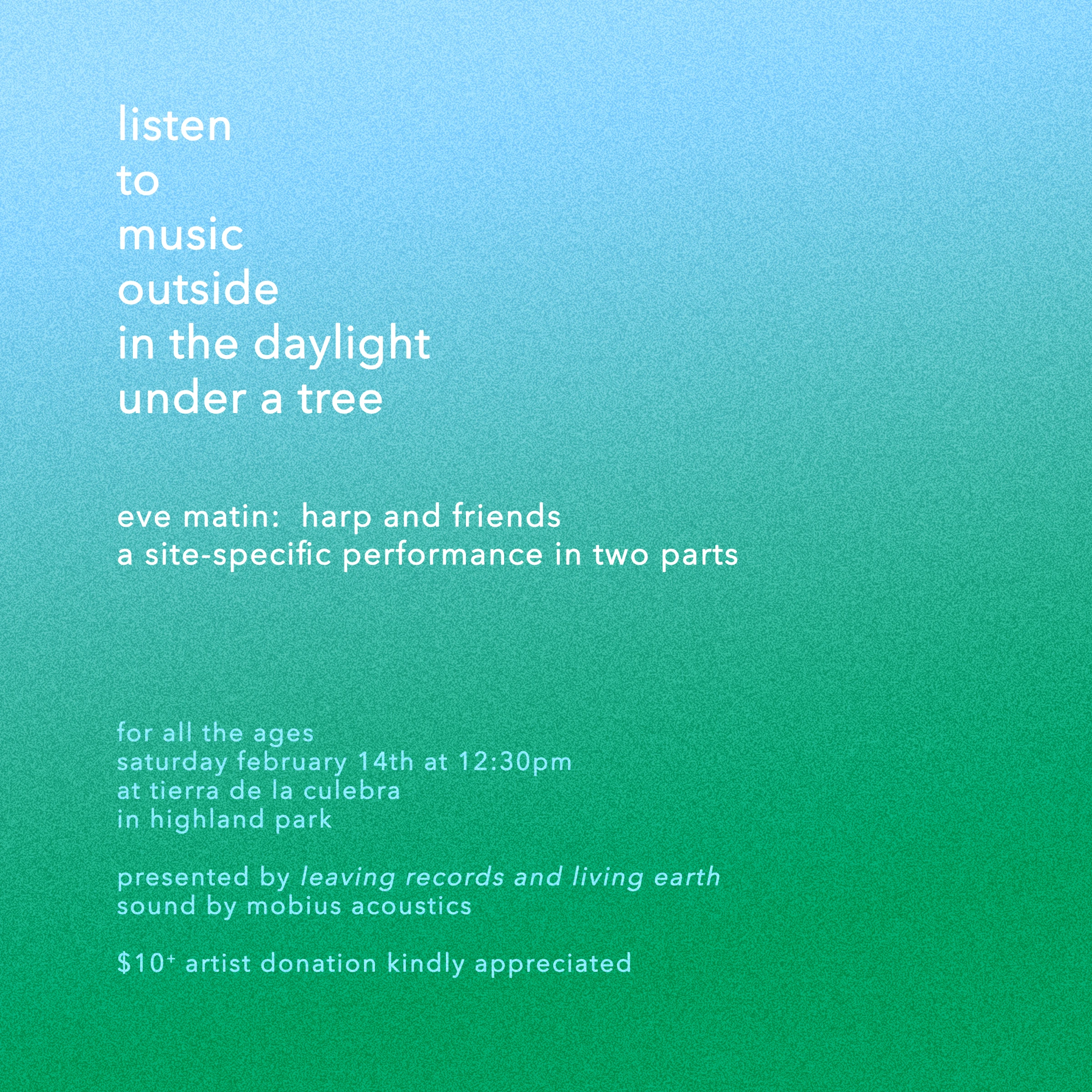 We’ll see you February 14th at La Tierra de la Culebra for a two part site specific performance for harp with Eve Matin & friends. Bring yr blanket, picnic, friends, pups, little ones, and gather underneath one of Highland Park’s oldest and wisest oak trees.