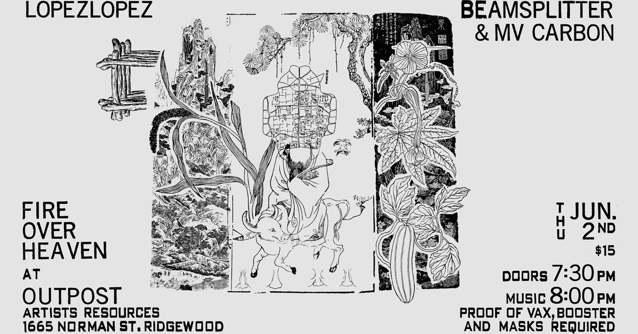 In the meantime, the final Fire Over Heaven concert of the season will happen on Thursday, June 2nd with an equally fantastic bill featuring LopezLopez (the bass and electronics duo of "Lopezs" Brandon and Cecilia) and amplified voice and trombone duo Beamsplitter, with special guest MV Carbon. Argentinian Cecilia Lopez is best known for her visceral, often sculptural, electro-acoustic works, while contrabassist, Brandon Lopez has cut a mean path through free jazz, noise and modern classical terrain. About LopezLopez, he writes "Cecilia and I play bass and electronics (You knew this, I'm sorry). She filters my bass through her synths. The outcome is some acoustic-electric music (unfortunately this is what it is, but the outcome isn't what I think people would expect, or at least I hope it isn't what one would expect) that deals with circumstantial and not so circumstantial phenomena (we improvise)."...BEAM SPLITTER is a duo for amplified voice, trombone and analog electronics. Utilizing the pure sounds of acoustic and closely amplified sound sources, the duo joins together two individual voices into a distinct dialog that delves beyond the borders of the corporeal elements of extended technique and sound. There is an intimacy and conflict that becomes evident as the two personas intertwine, in moments joining together seamlessly and in the next, being left with the feeling of irrevocable fracture. The two manage between these extremes with a kind of improvised grace that reveals an effort towards a common goal. It is an honest metaphor for a human relationship in process that even in the most serene moments can leave one raw and entirely exposed. They will be joined by multimedia artist MV Carbon, whose electrifying cello, vocal and tape machine music have been integral to the band Metallux, her long running project with Jenny Graf, as well as collaborations with Eve Essex, Hunter Hunt-Hendrix, the late Tony Conrad, and countless other points in the noise multiverse.