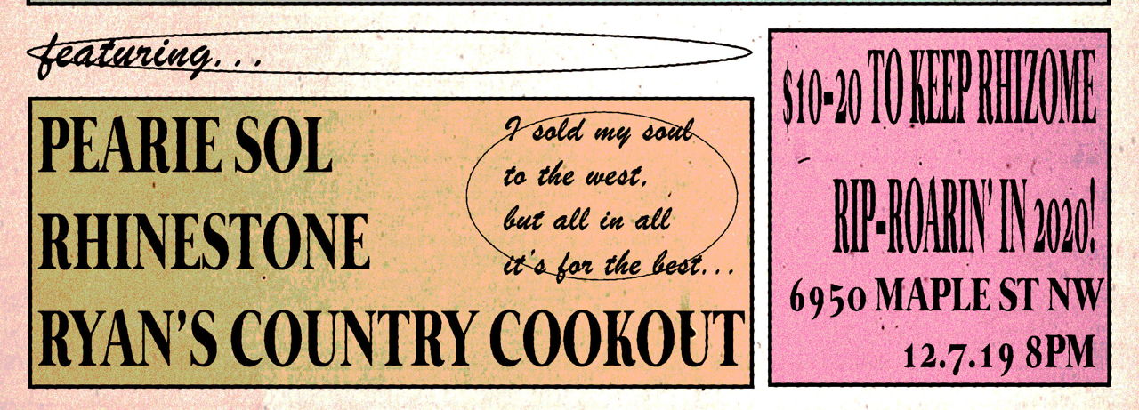 We're hosting a goshdarn country-themed show to benefit your favorite DIY space. Come on down and enjoy the tunes and throw $10-20 in the cowboy hat.