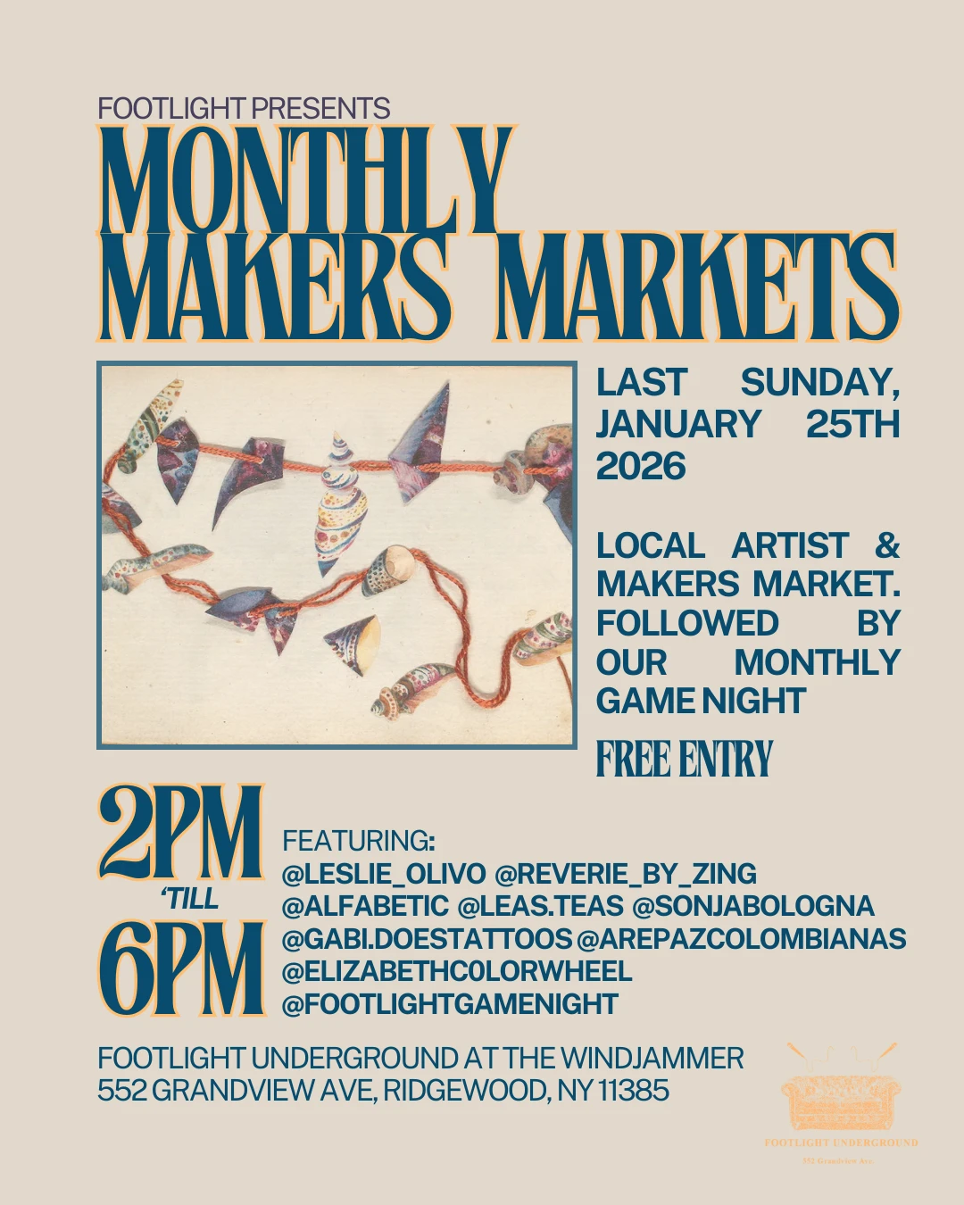 Join us every last Sunday for a full day of fun! We will be hosting a makers market with a rotating list of local makers followed by Footlight game night which will feature a new video game each month along with a selection of board games to choose from.