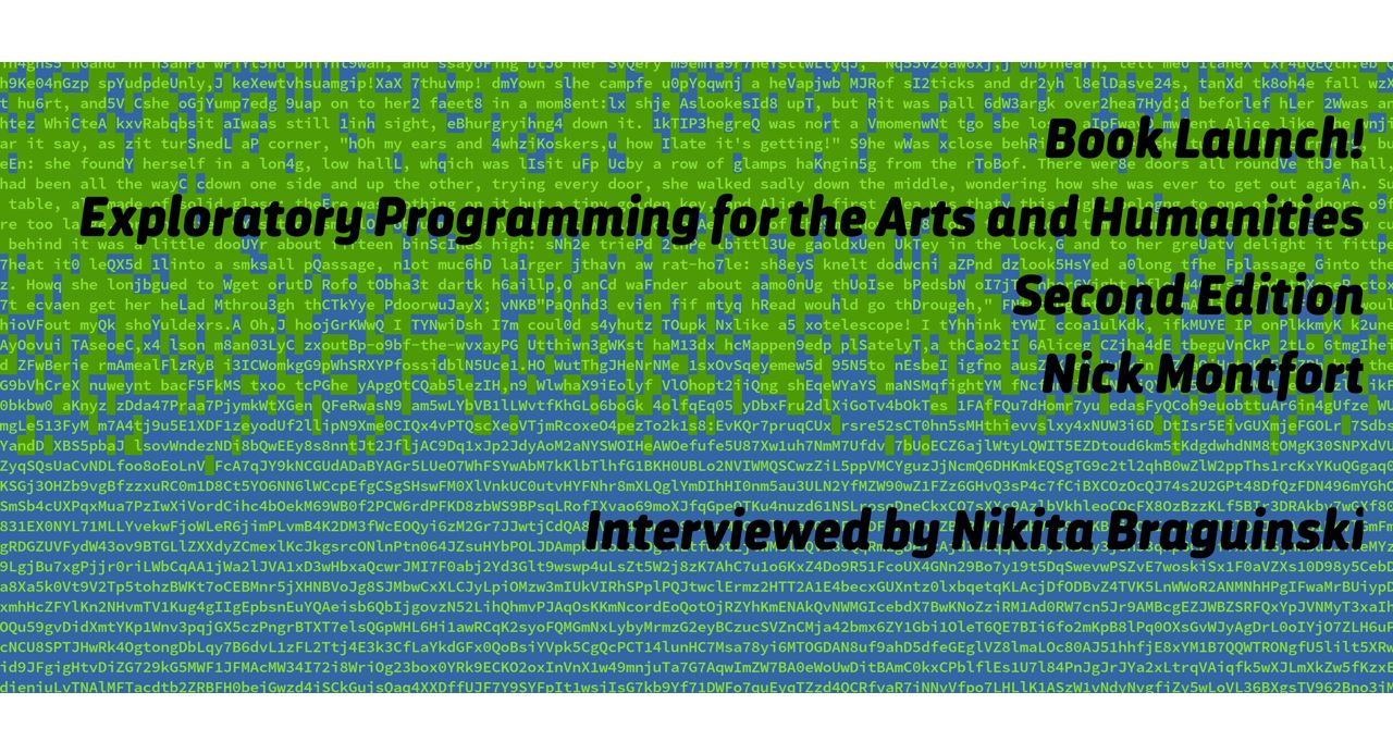In conversation with Berlin-based scholar Nikita Braguinski, author Nick Montfort will discuss how programmers can create new kinds of artworks and to probe data for new ideas, as well as how computing exists in a cultural context. He will cover some less typical approaches in the book — learning across media types and programming languages. Nick and Nikita will also discuss the relationship between “arts” (generative) and “humanities” (analytical) types of programming.