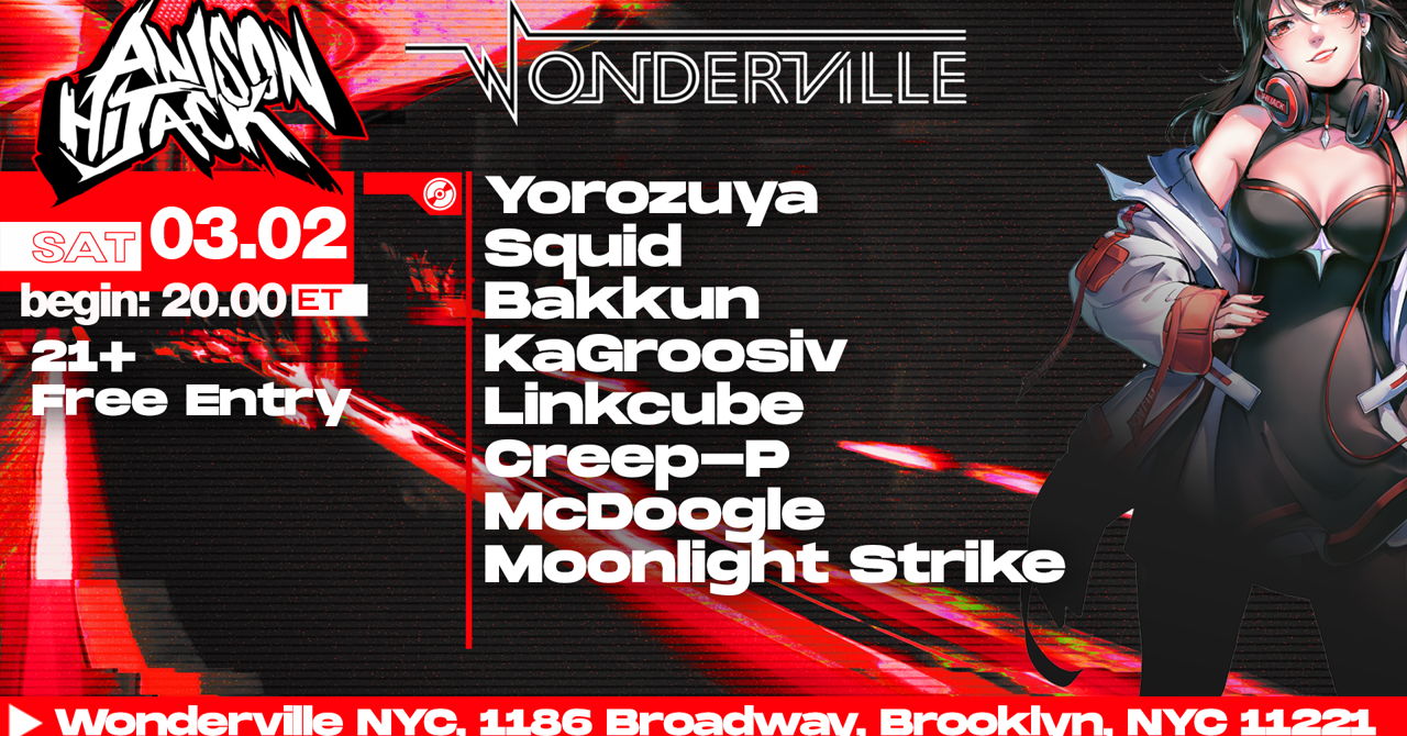Catch the hottest otaku dance party in NYC! Expect a night of music that'll be sure to please every anime-loving party animal around. We've got anime remixes and originals of future funk, techno, drum n bass, dubstep, and much more! And best of all - it's free entry!