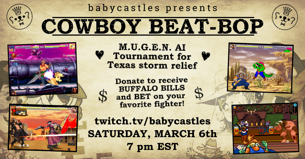 A fundraiser for Texas winter storm relief. Join Babycastles on Twitch for a tournament of 1-on-1 showdowns between unbalanced wild west AIs, with live play-by-play from @crezno.