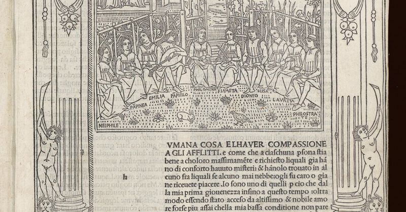 Roundtable Reading of Classic Plague Smut: excerpts from The Decameron, "a collection of novellas by the 14th-century Italian author Giovanni Boccaccio (1313–1375). The book is structured as a frame story containing 100 tales told by a group of seven young women and three young men sheltering in a secluded villa just outside Florence to escape the Black Death, which was afflicting the city.... The various tales of love in The Decameron range from the erotic to the tragic." (Wikipedia)