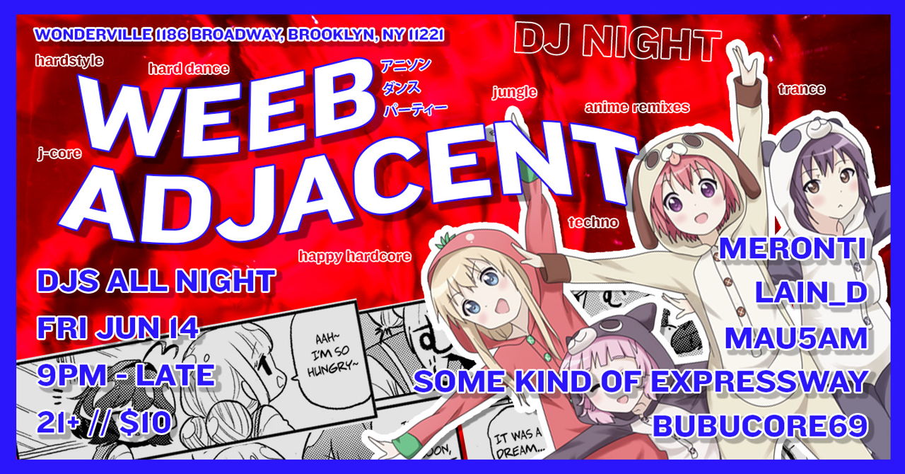 WEEB-ADJACENT is your monthly series of anime con afterhour jams by the best chronically online DJs the algorithm has to offer. Come thru for anime songs, speedcore, hard dance, techno, gabber, jungle, hyperpop, and more!!