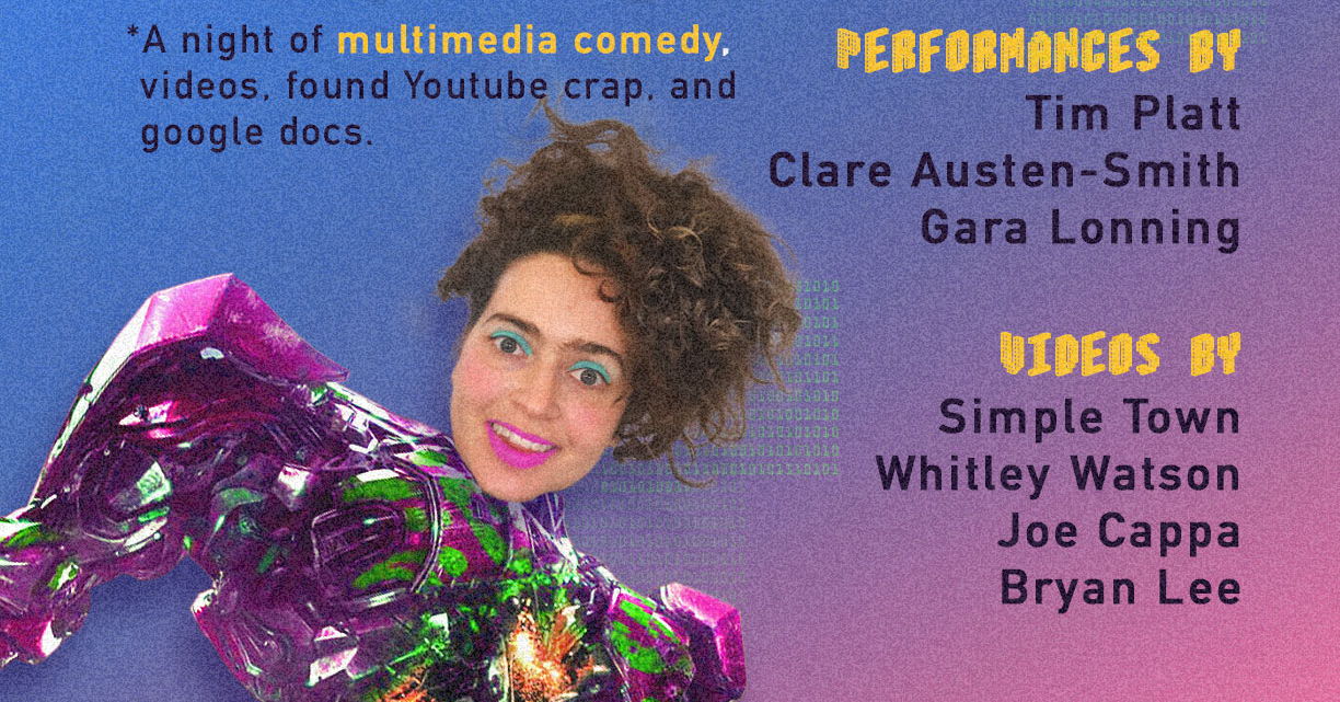A digital comedic experience. Watch animations, videos, comedians interacting with slideshows and more. Marissa Goldman (@themediawitch_), a comedian and video artist hosts a night of comedy featuring work from comedians, video artists, Google Docs and found youtube videos. She is the creator of the Google Doc Quarantine Party, and is bringing it back but live. Audience members add to a Google doc which will be reviewed throughout the show. Produced by Matt Albani.