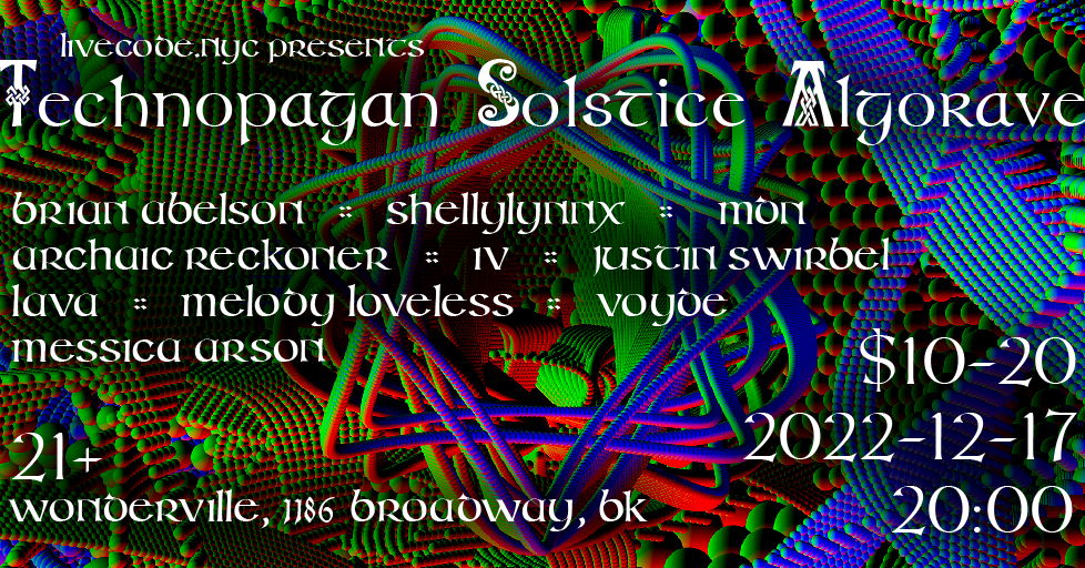 LivecodeNYC is filling the midwinter night with arcane computer magic. The world is dark and cold, but we'll keep warm with our revelry and overheating GPUs. Come dance and celebrate the coming year with chaotic code-based beats and visions. Featuring sets by:
