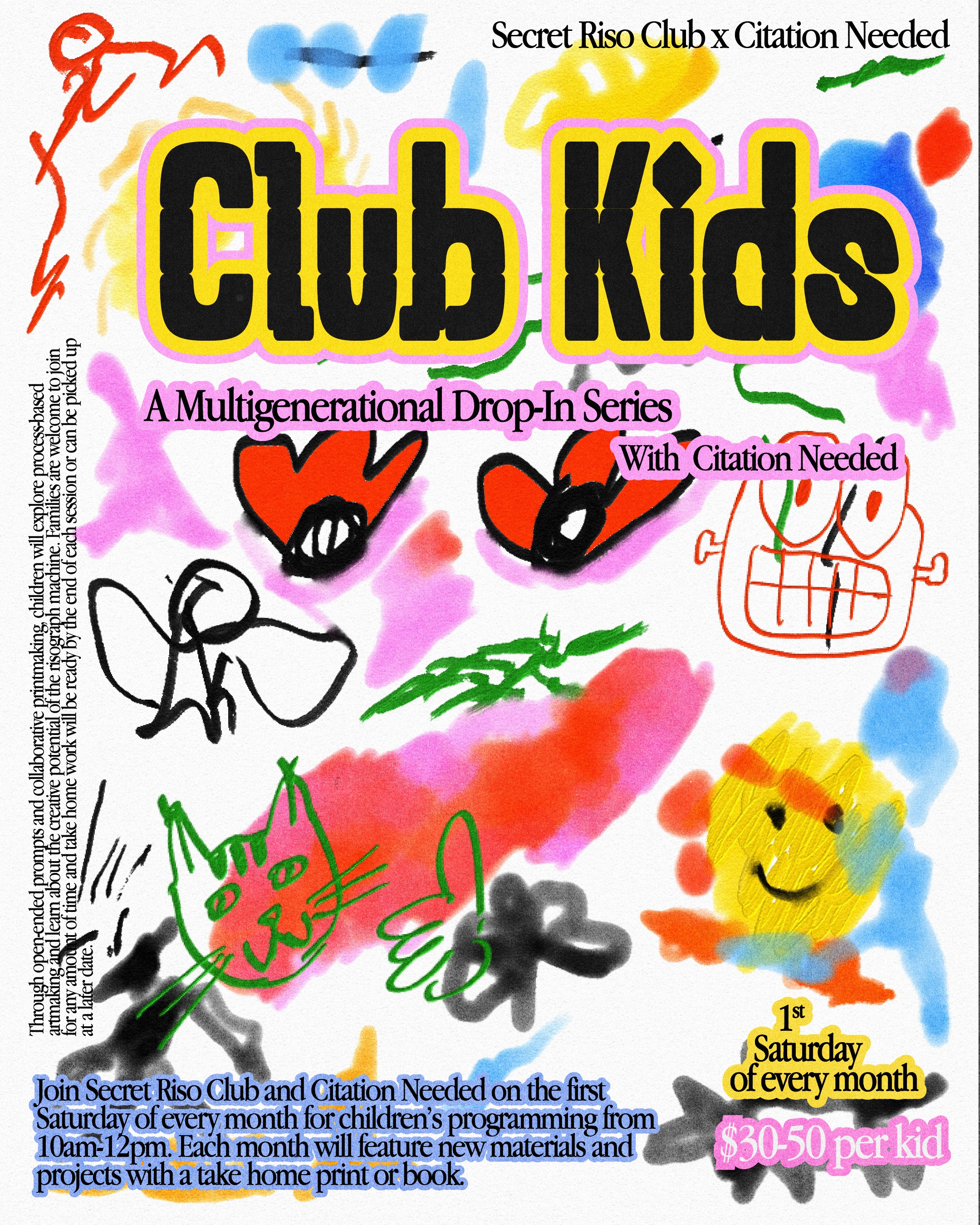 Sliding scale - $30 - $50, pre-register or drop-in. All classes held in person with all materials provided at Secret Riso Club in Bushwick. Parents encouraged to join in the art-making, but there's a coffee shop across the street if a moment alone is needed :)