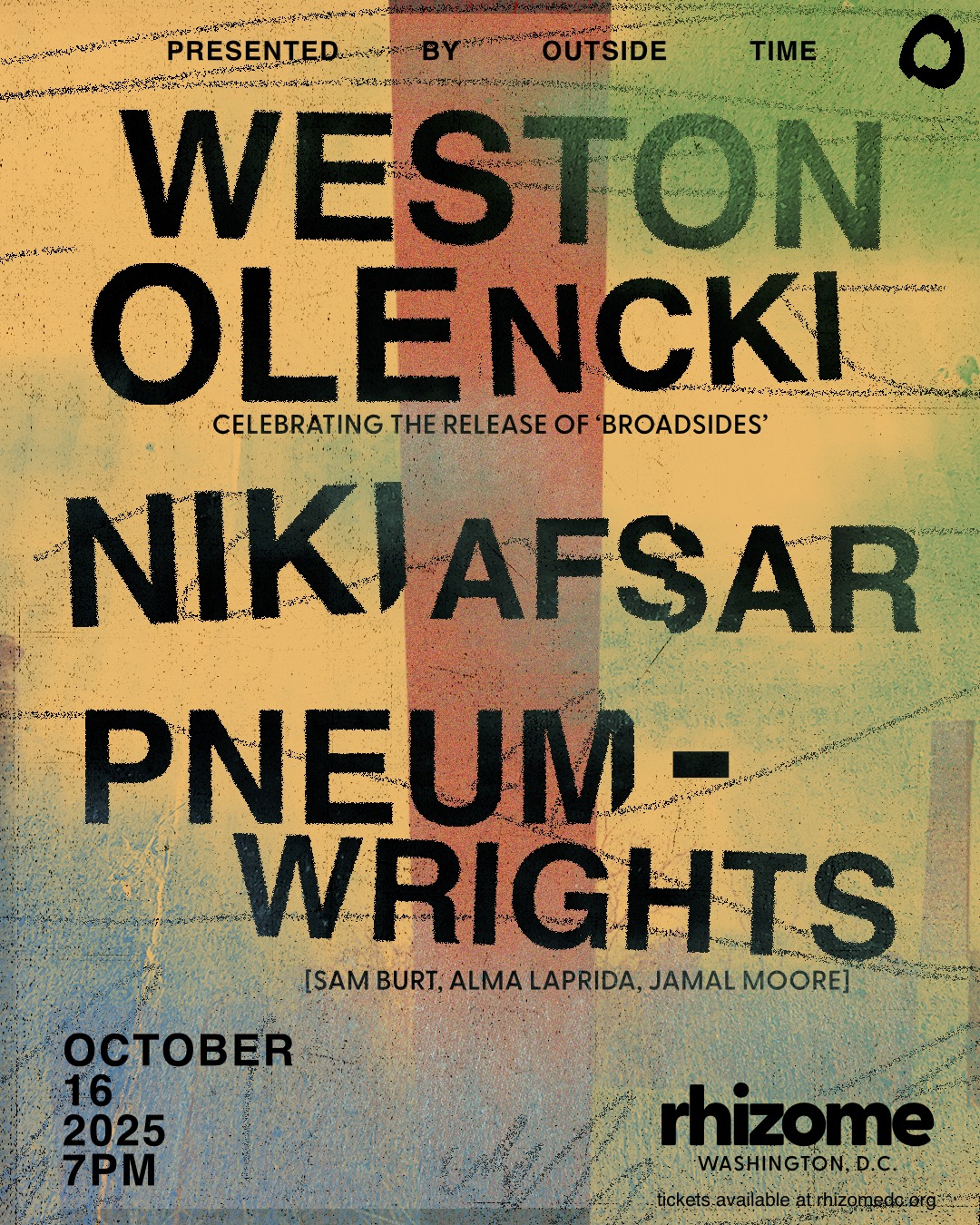 Join us for a night of outward-bound music celebrating the release of Broadsides, the new album by Berlin-based sound artist and composer Weston Olencki. The album is the first LP release on DC-based label Outside Time. Each artist's work speaks to concepts of tradition and innovation in striking, unique ways. Olencki will perform work from Broadsides, Pneumwrights will improvise, and niki afsar will perform a composition entitled "baraye nika (for Nika)".