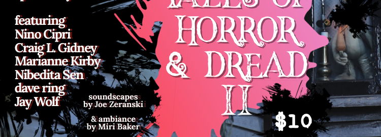 Tales of Horror & Dread II, an evening of horror and spooky stories. 7pm November 1st. $10. Featuring readings from Nino Cipri, Craig L. Gidney, Marianne Kirby, Nibedita Sen, dave ring and Jay Wolf. Nightmare soundscapes by Joe Zeranski. Ambiance by Miri Baker. Also: tarot readings, a necromancer cotillion, and who knows what else! Creepy dress encouraged; when in doubt, put a skull on it. Boo.
