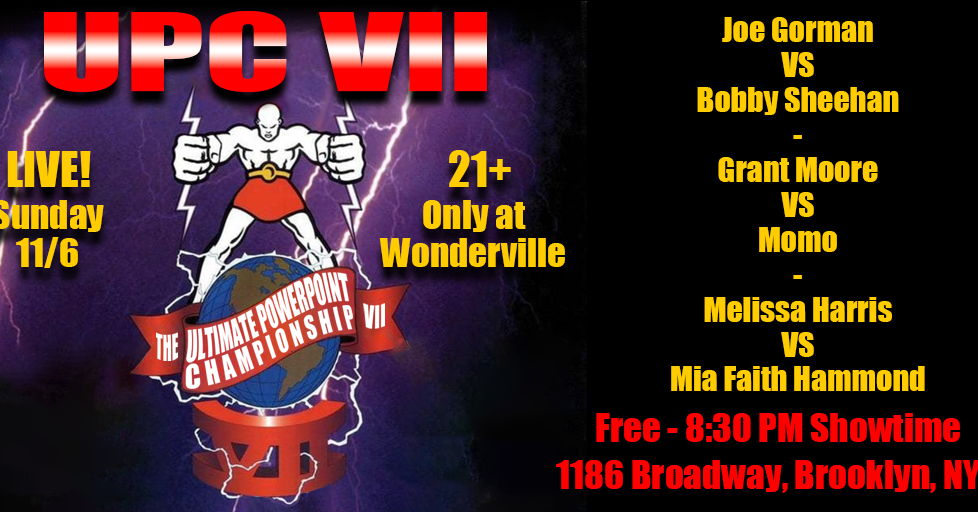 The Ultimate PowerPoint Championship is a blind presentation competition where pairs of comics face off presenting a PowerPoint they have never seen before!