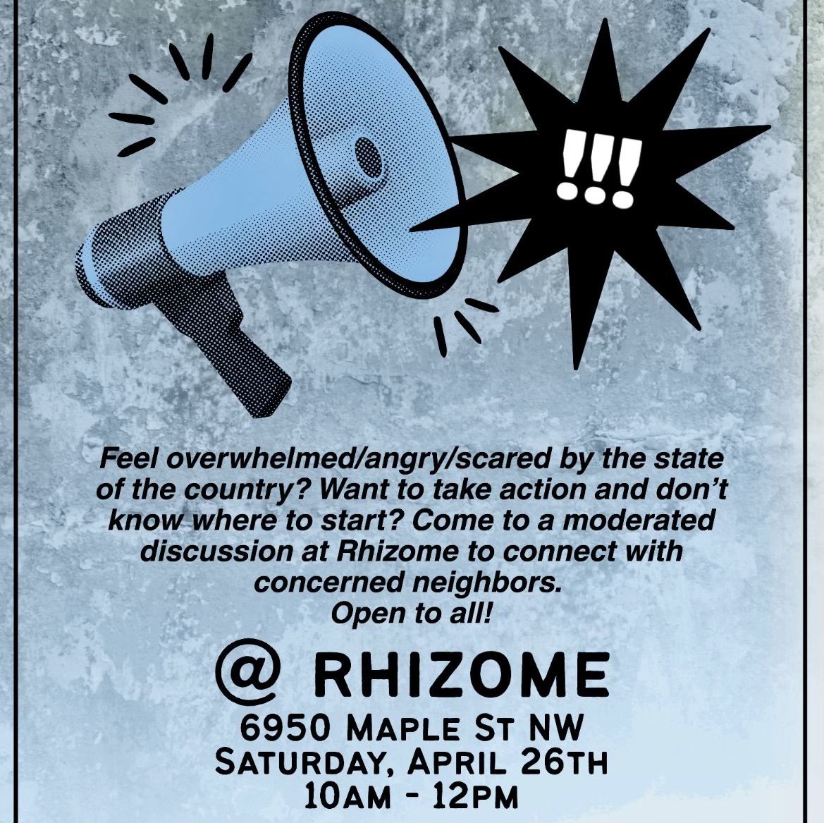 Feel overwhelmed/angry/scared by the state of the country? Want to take action and don't know where to start? Come to a moderated discussion at Rhizome to connect with concerned neighbors. Open to all!