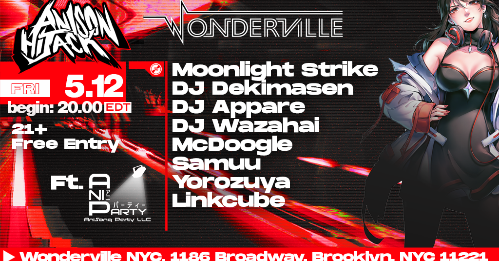 Catch the hottest otaku dance party in NYC! Expect a night of music that'll be sure to please every anime-loving party animal around. We've got anime remixes and originals of future funk, techno, drum n bass, dubstep, and much more! And best of all - it's free entry!