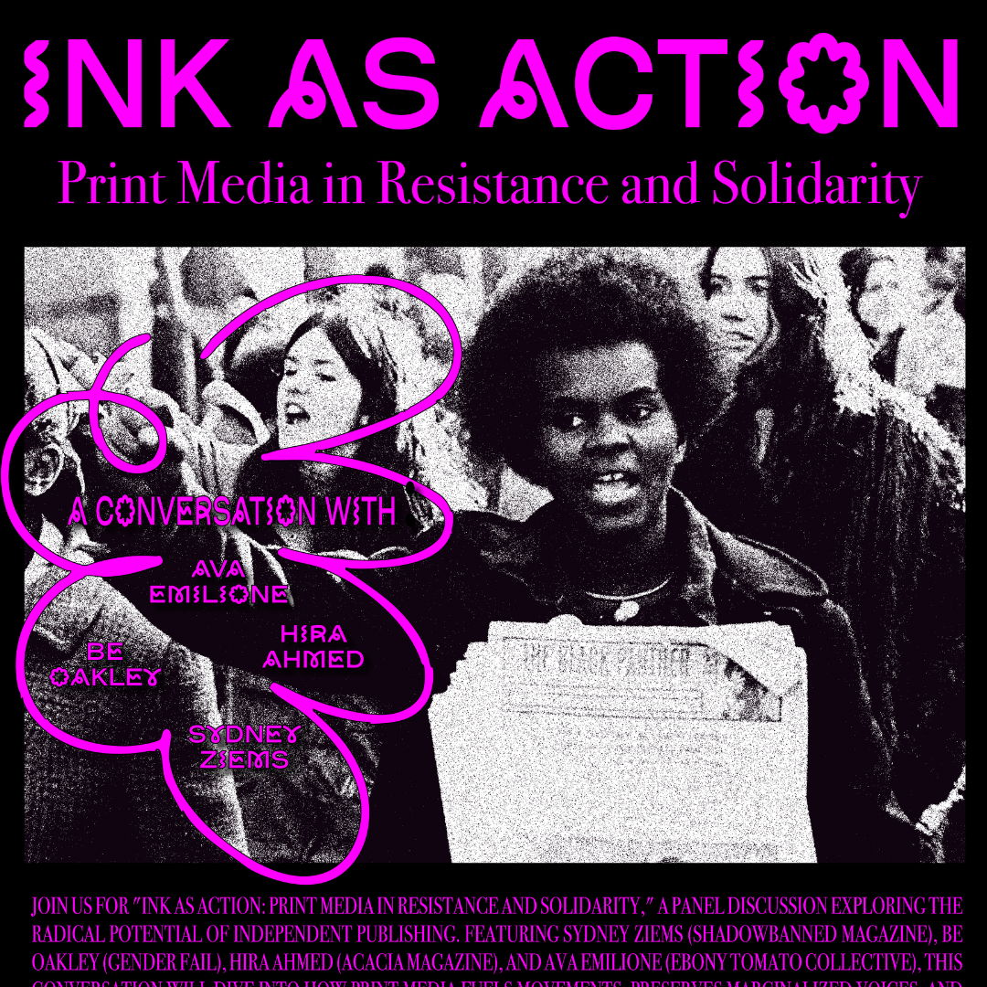 Join us for "Ink as Action: Print Media in Resistance and Solidarity," a panel discussion exploring the radical potential of independent publishing. Featuring Sydney Ziems (@shadowbannedmagazine), Be Oakley (@genderfail), Hira Ahmed (@acacia_mag), and Ava Emilione (@ebonytomatoescollective), this conversation will dive into how print media fuels movements, preserves marginalized voices, and builds networks of resistance in the face of digital censorship.