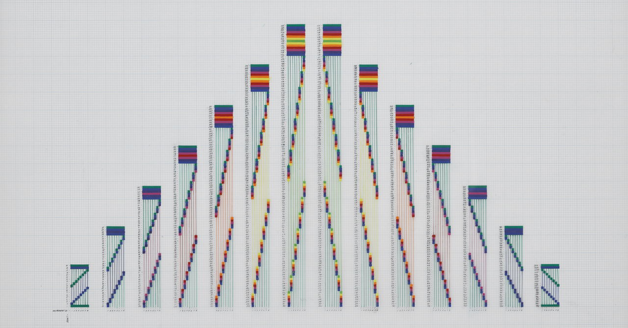 Alongside “Distances Bending,” Lane and de Asís will perform an original composition adapted from the visual art of Channa Horwitz (1932–2013), who, like the duo, was interested in how a mathematical pattern, sustained for a sufficiently long duration, can begin to resemble randomness. In Horwitz’s Sonakinatography (Time–Motion–Notation) series, she iterated a sequence of eight colors—from 1, a dark green, to 8, a pale green—over sprawling sheets of graph paper (often up to thirty square feet). In the resulting patterns, the movement of colors over space represents movement over time. By assigning each of those eight colors to eight real-world objects—e.g., sonic frequencies, bodily gestures, or light sources—artists can then interpret Horwitz’s illustrations as notations—e.g., musical scores, studies for choreography, or light installations. Here, Lane and de Asís interpret Horwitz’s Sonakinatography #17 (1987–2004) as a 4-channel rendition for tape, flutes and synthesizer, which shares with “Distances Bending” an interest in sound that rises to an apex and culminates in ecstasy.
